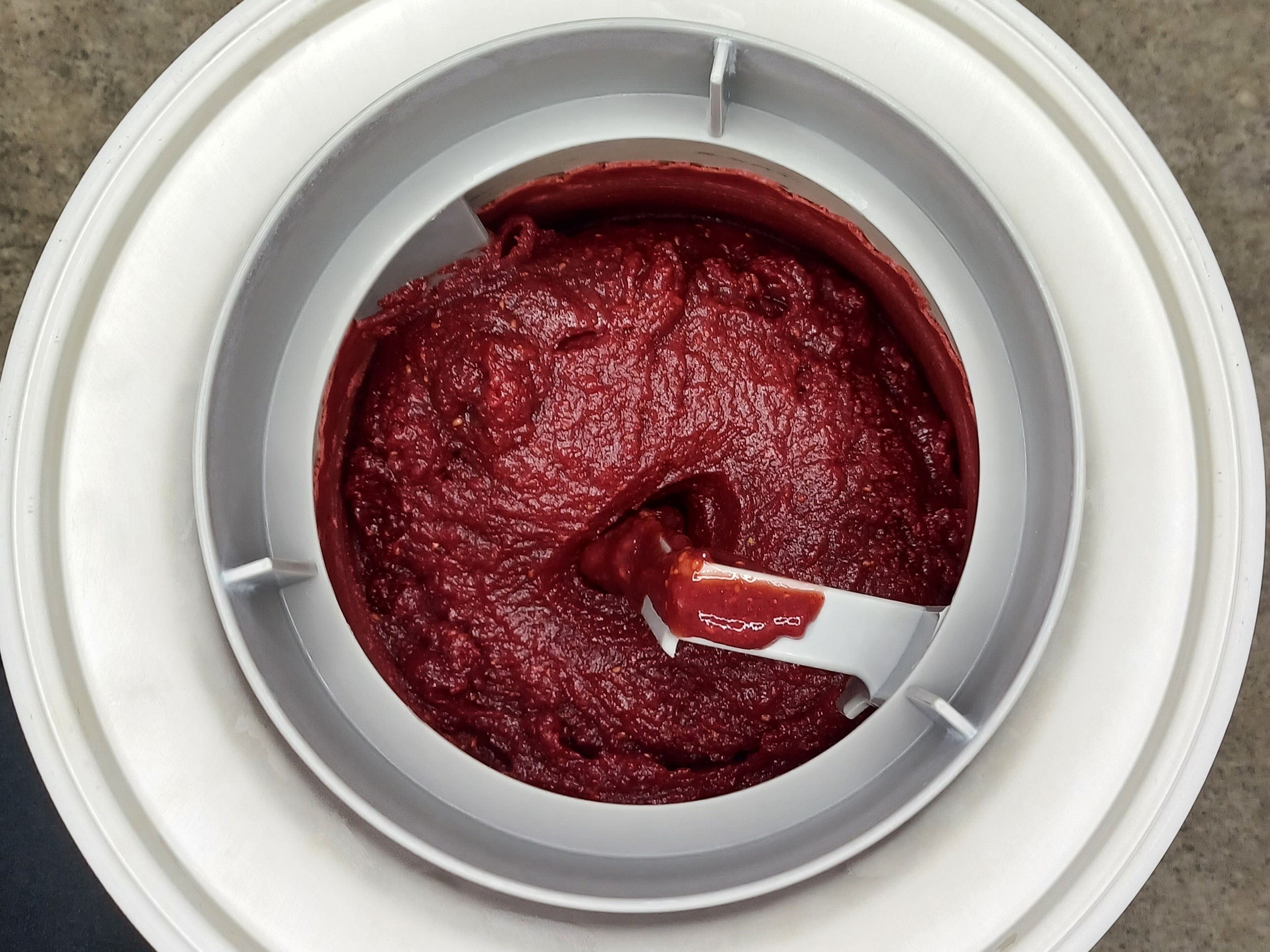 The mixture will be quite thick, because we're using whole fruits instead of juice, but that's expected. It will churn just fine.