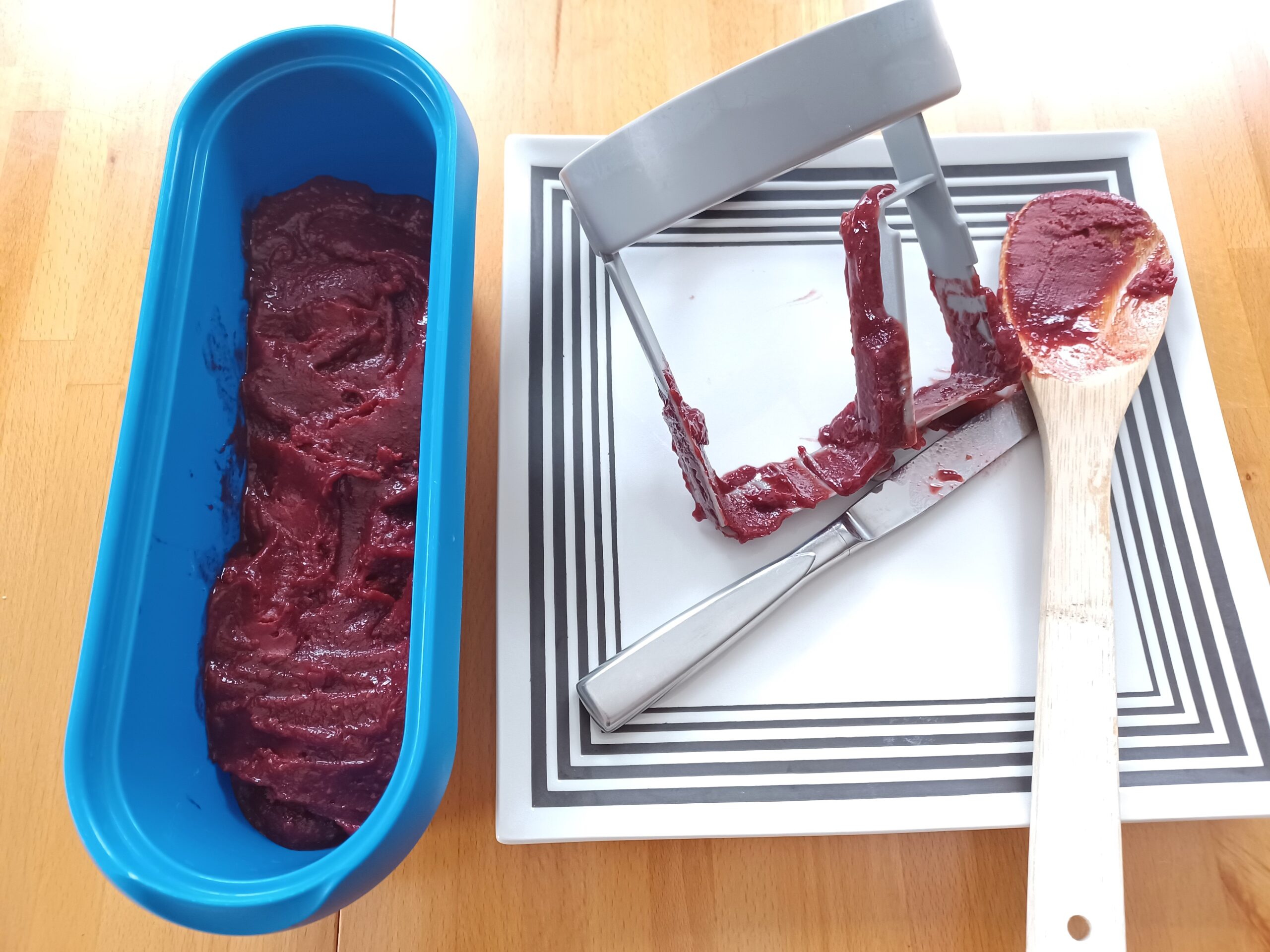 Before you start churning, set up everything you'll need to quickly transfer the sorbet from the machine into a container for freezing. I use a knife to scrape down the dasher (or paddle) and a wooden spoon to scoop out the sorbet.